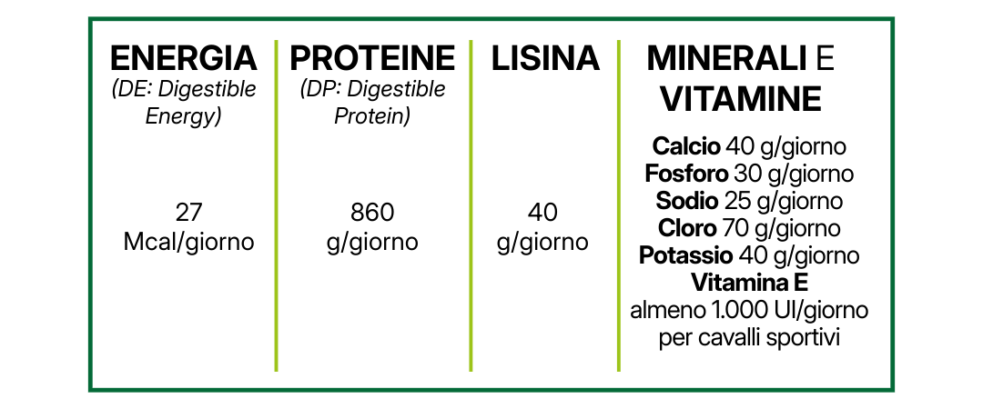 Se prendiamo in considerazione un cavallo di 500 kg, con un BCS di 4 (condizione corporea buona ma leggermente magro) che svolge competizioni di salto ostacoli di categoria 130 cm, con 6 allenamenti a settimana da 1h ciascuno, i suoi fabbisogni nutrizionali sono: